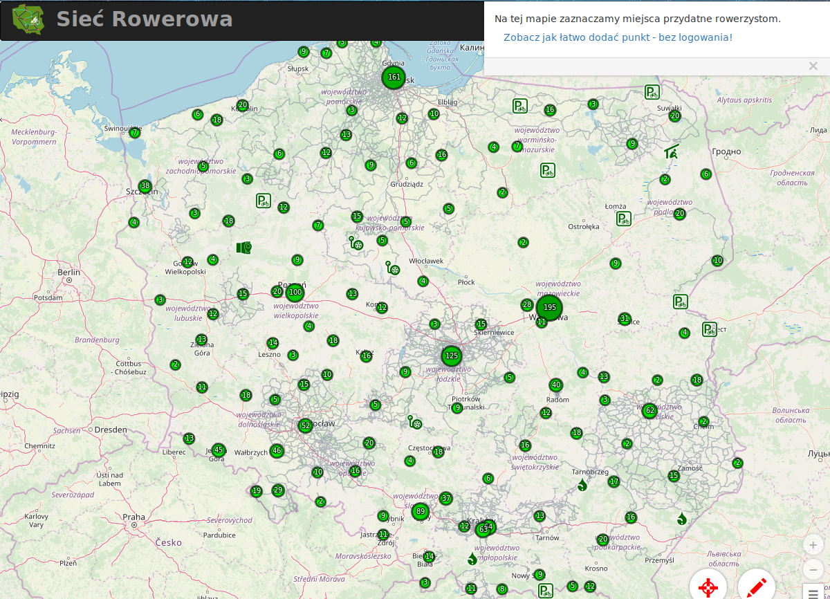 Na tej mapie zbieramy miejsca istotne dla rowerzystów (serwisy, wiaty, parkingi rowerowe itp). Wprowadź miejsce w swojej okolicy za pomocą kilku kliknięć wprost z telefonu lub komputera – bez logowania!